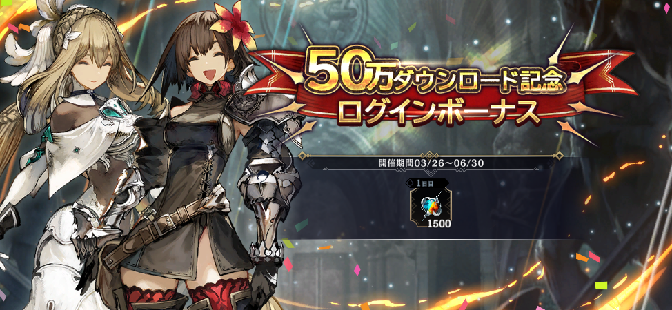 50万ダウンロードを記念した、10連ガチャ分の「ジェム」1,500個が手に入るログインボーナスです。