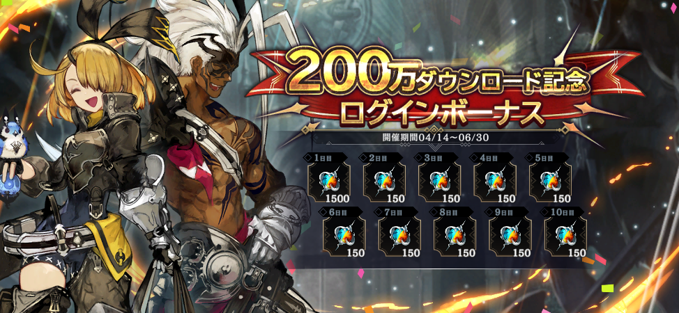 200万ダウンロードを記念した、合計で2,850個の「ジェム」が手に入るログインボーナスです。初日で「ジェム」1,500個が手に入ります。