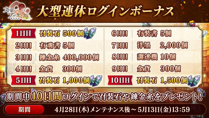 大型連休を記念して、期間中ログインすると最大で召装石3000個(召装10回分)や錬金糸など豪華アイテムをプレゼント!