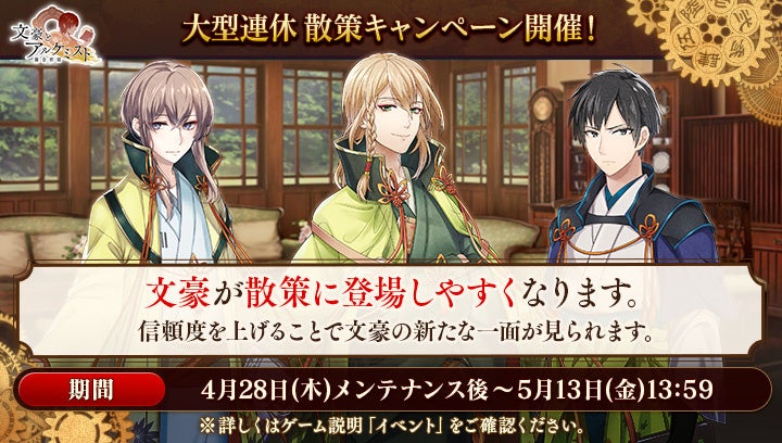 合同会社EXNOA(本社:東京都港区、CEO:村中 悠介、URL:https://games.dmm.com/)が運営するDMM GAMESは、4月28日(木)より、女性向け文豪転生シミュレーションゲーム「文豪とアルケミスト」において、『大型連休ログインボーナス』と『大型連休 散策キャンペーン』を開催いたしました。