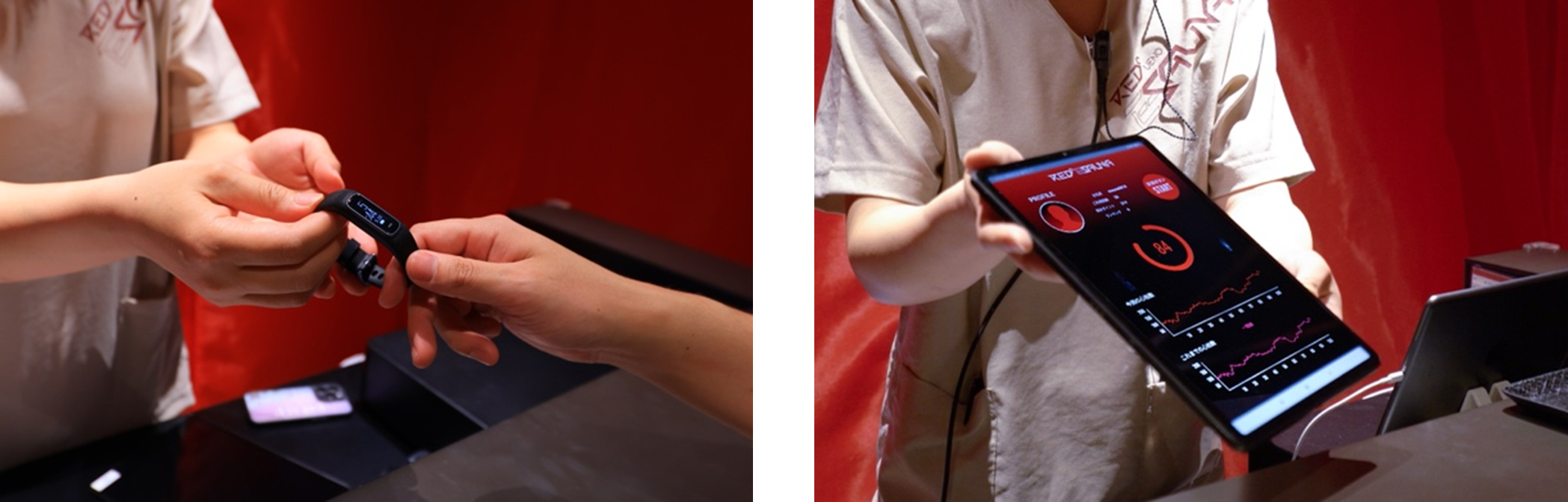 受付時にお貸し出しする専用ブレスレット「TOTONOU BAND」を装着したまま、サウナ、水風呂、休憩時間をお楽しみいただくことで、心拍数を主とした数値を計測。その情報を元に、サウナ上級者から初級者まで老若男女問わず幅広い世代のサウナ体験を分析して開発した、RED°E-SAUNA UENO独自のアルゴリズムで、“ととのう”を1〜100点で数値化します。これまで感覚的に感じていた“ととのう”が見える、新感覚の体験をお楽しみください!