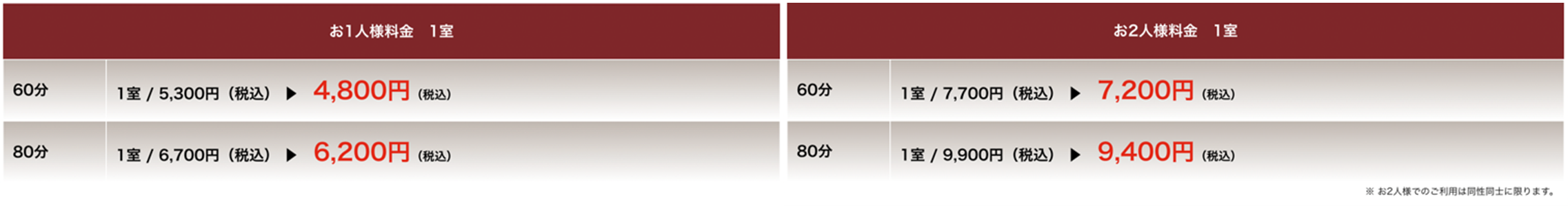 60分)1人用:30,000円、2人用:45,000円 / 80分)1人用:40,000円、2人用:60,000円