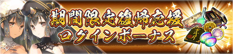 本作にしばらくログインされていなかったユーザーの皆様を対象に、特別なログインボーナスを期間限定で開催いたします。期間中にログインすると、「研鏡(金環)」や「宝珠」など豪華アイテムを多数プレゼントいたします。