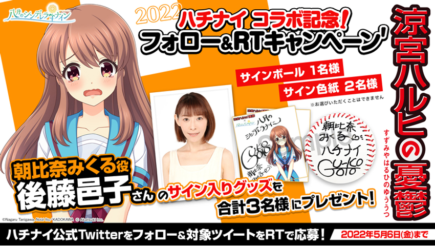 期間中、八月のシンデレラナイン公式アカウント(@hachinai89 https://twitter.com/hachinai89 )をフォローし、ハッシュタグ「#ハチナイ_涼宮ハルヒ登場」や「#ハチナイ_朝比奈みくる登場」を含む公式ツイートをリツイートしてくださった方の中から、直筆サインボールやサイン色紙をプレゼントいたします。