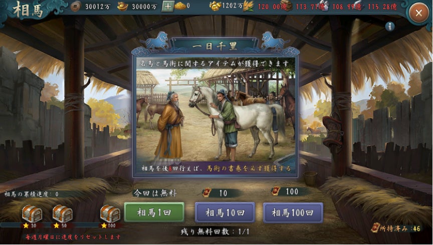 「相馬」は馬場で追加された新機能になります。名馬や名馬装備だけでなく、馬術のレベルアップに必要な書巻や相馬経を獲得することが可能になります。