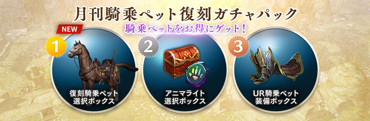「月刊騎乗ペット復刻ガチャ」では、1等の復刻騎乗ペット選択ボックスに「ロデオ召喚セットボックス」を追加いたしました。