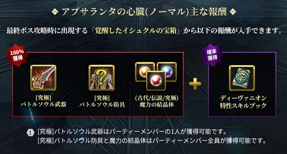「アプサランタの心臓:ノーマル」では報酬のアップグレードも行われ、最終ボス討伐時のドロップアイテム「覚醒したイシュクルの宝箱」からは、100%の確率で「[究極]バトルソウル武器」をパーティメンバーの1人が獲得することができます。加えて、パーティメンバー全員が「[究極]バトルソウル防具」と「魔力の結晶体」を獲得できます。さらに、「ディーヴァニオン特性スキルブック」が確率で獲得可能です。