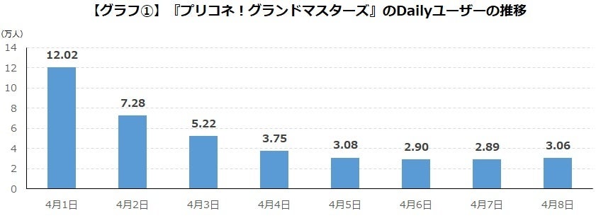 リリース初日である4月1日のアクティブユーザー数は12.02万人、その後減少していき、4月5日以降は3万人程度で推移しています。【グラフ①】