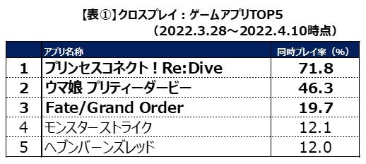 最も同時プレイ率が高いのは、やはり『プリンセスコネクト!Re:Dive』で、71.8%でした。【表①】