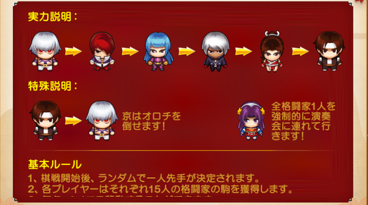 拳王棋戦は、マッチングもしくはフレンドと1対1で対戦するミニゲームです。強い棋で弱い棋を攻撃し勝敗を競います。決着後に獲得したボーナスは、建造機能もしくはアイテム交換で使用可能です。