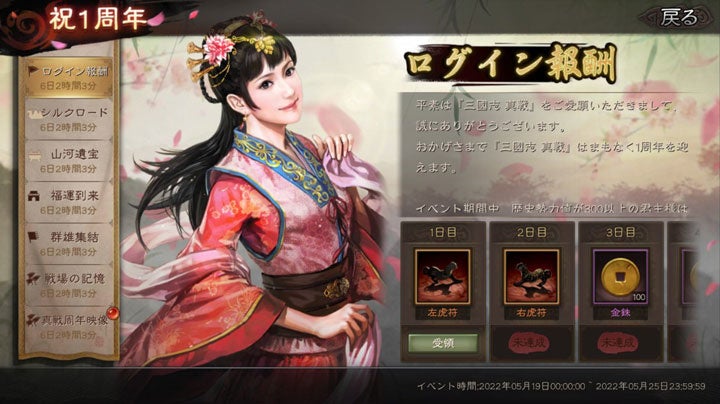 イベント期間中、歴史勢力値が300以上の君主様はゲームにログインすると、祝1周年報酬を毎日受け取ることができます。