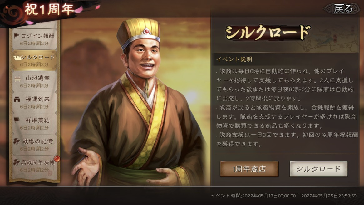 2022年5月19日(木)から5月25日(水)の間、『三國志 真戦』ゲーム内では七つの1周年記念イベントが開催されます。どれも豪華な報酬をたくさん用意しておりますので、ぜひ毎日忘れずに参加してください!