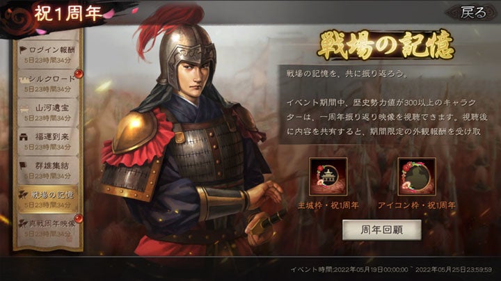 イベント期間中、歴史勢力値が300以上の君主様は、1周年振り返り映像を視聴できます。視聴後に内容を共有すると、期間限定の外観報酬を受け取れます。