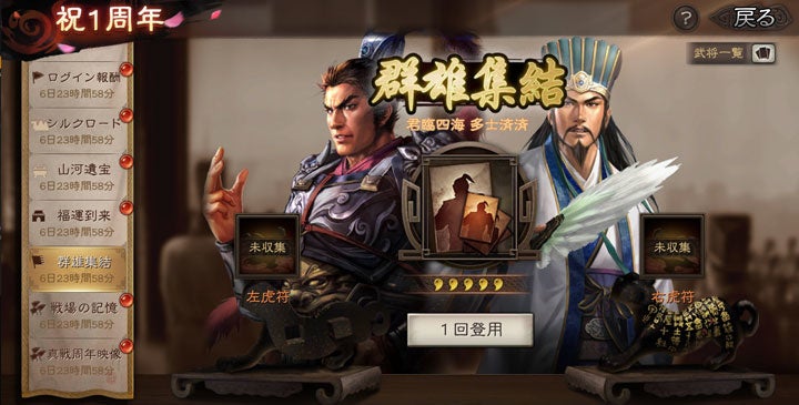 祝1周年イベントのログイン報酬イベントに参加すると、左右虎符を獲得でき、両方の虎符を集めると登用のチャンスを獲得できます。