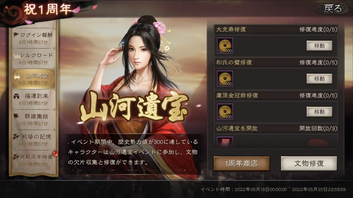 遺宝開放と他の君主様の文物修復の手伝いで周年祝報酬を獲得でき、1周年商店で各種アイテムを購入できますので、ぜひ積極に参加してください!