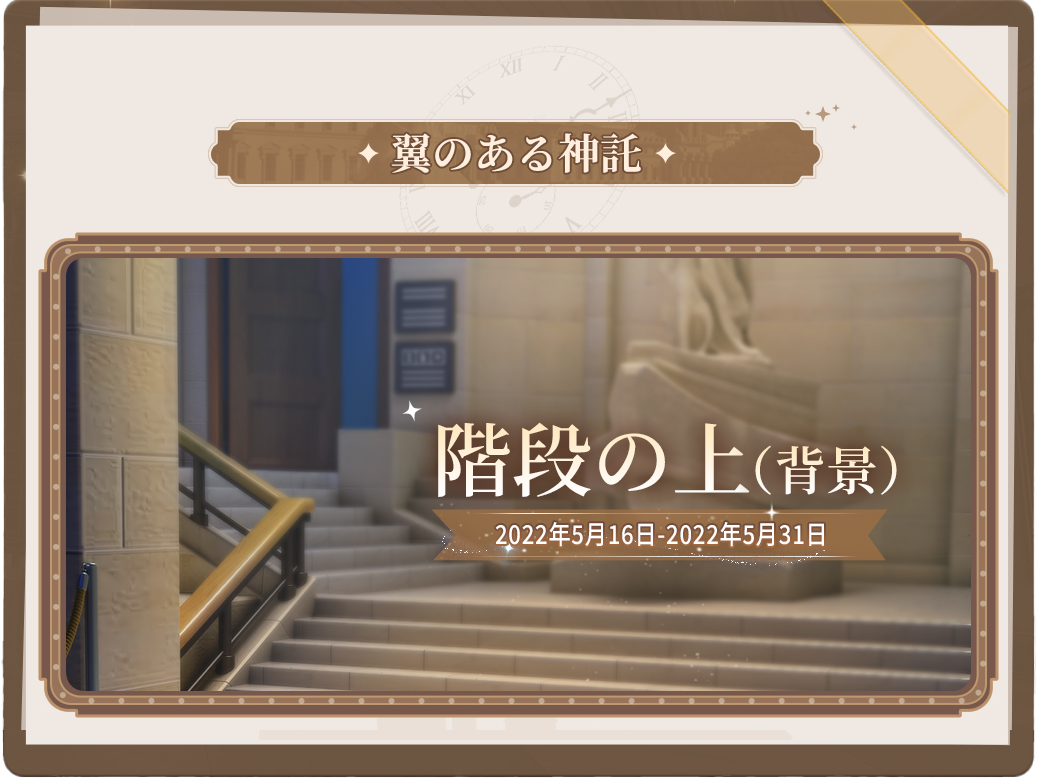 期間中毎日ログインすることで、勝利の女神から手紙を貰い、お礼にヤシの葉をプレゼントしましょう。一定数に達することで報酬を獲得することができます。7日間ログインで「階段の上(背景)」を獲得することができます。