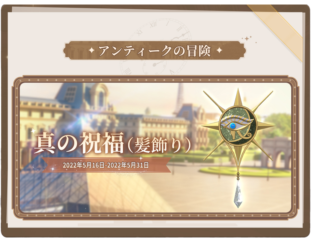 「アンティークの冒険」のクエストを達成することで、クラシックバッジを獲得することができます。真の祝福(髪飾り)等のイベント関連アイテムと交換しましょう!