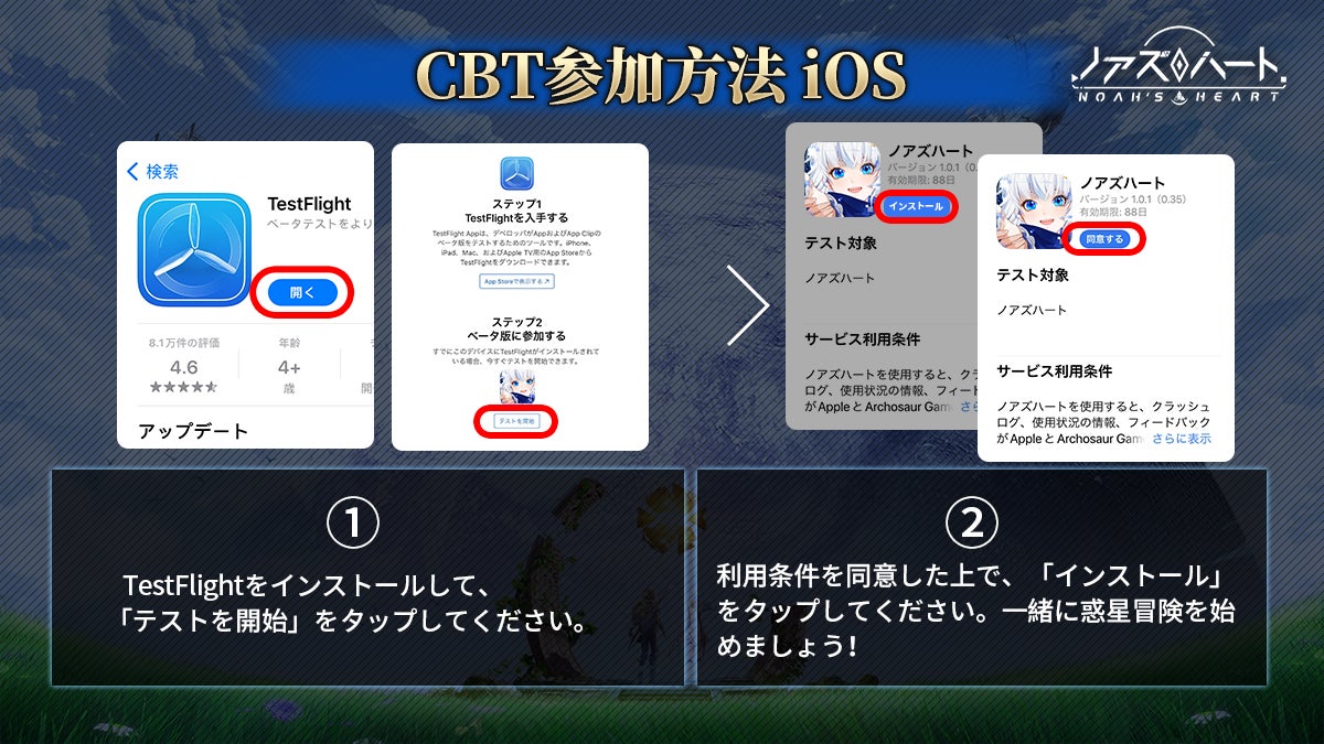 iOS版は、使用するiOSデバイスに「TestFlight」をインストールする必要がございます。あらかじめAppStoreより「TestFlight」をダウンロード/インストールいただけますようお願いいたします。操作手順は下記のイメージ通りです。