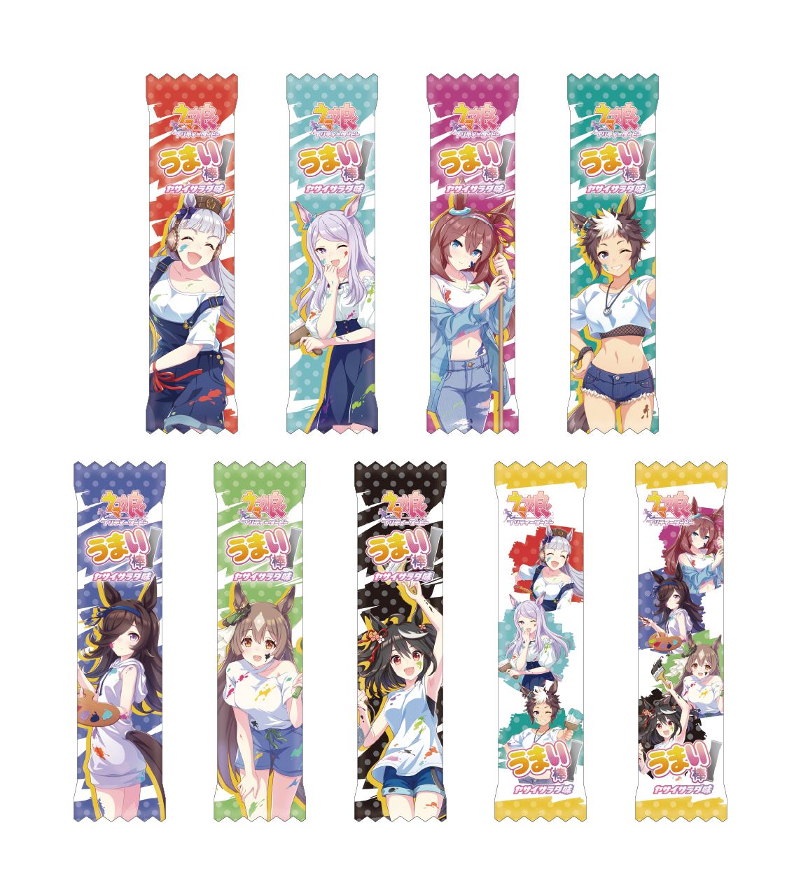 | 2022年6月3週登場予定 3. ウマ娘 プリティーダービー うまい棒ヤサイサラダ味 種類:全9種 ナムコ限定描き下ろしイラストをパッケージにデザインした、ヤサイサラダ味のうまい棒です。 |