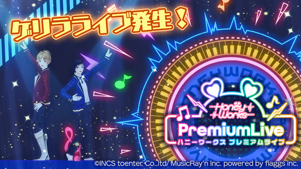 株式会社flaggs(本社:東京都品川区、代表取締役CEO:吉江直人)と株式会社インクストゥエンター(本社:東京都渋谷区、代表取締役:田村優)は、HoneyWorks初のスマートフォン向け公式リズムゲーム『HoneyWorks Premium Live(以下ハニプレ)』にて、本日5月19日(木)から5月24日(火)までの間、新しいゲリラライブが発生することをお知らせいたします。
