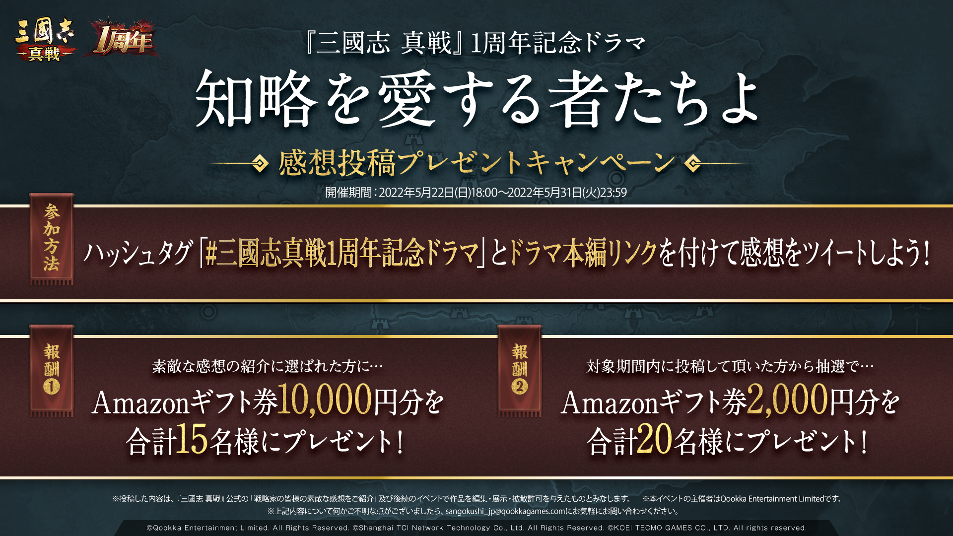 Qookka Entertainment Limitedが株式会社コーエーテクモゲームスの歴史シミュレーションゲーム『三國志13』のIPを使用し、同社監修の元で開発されたスマートフォン向けゲームアプリ『三國志 真戦』。同ゲームは、2022年5月22日(日)に、YouTube公式アカウントで1周年記念ドラマ「知略を愛する者たちよ」の配信を実施することをお知らせいたします。