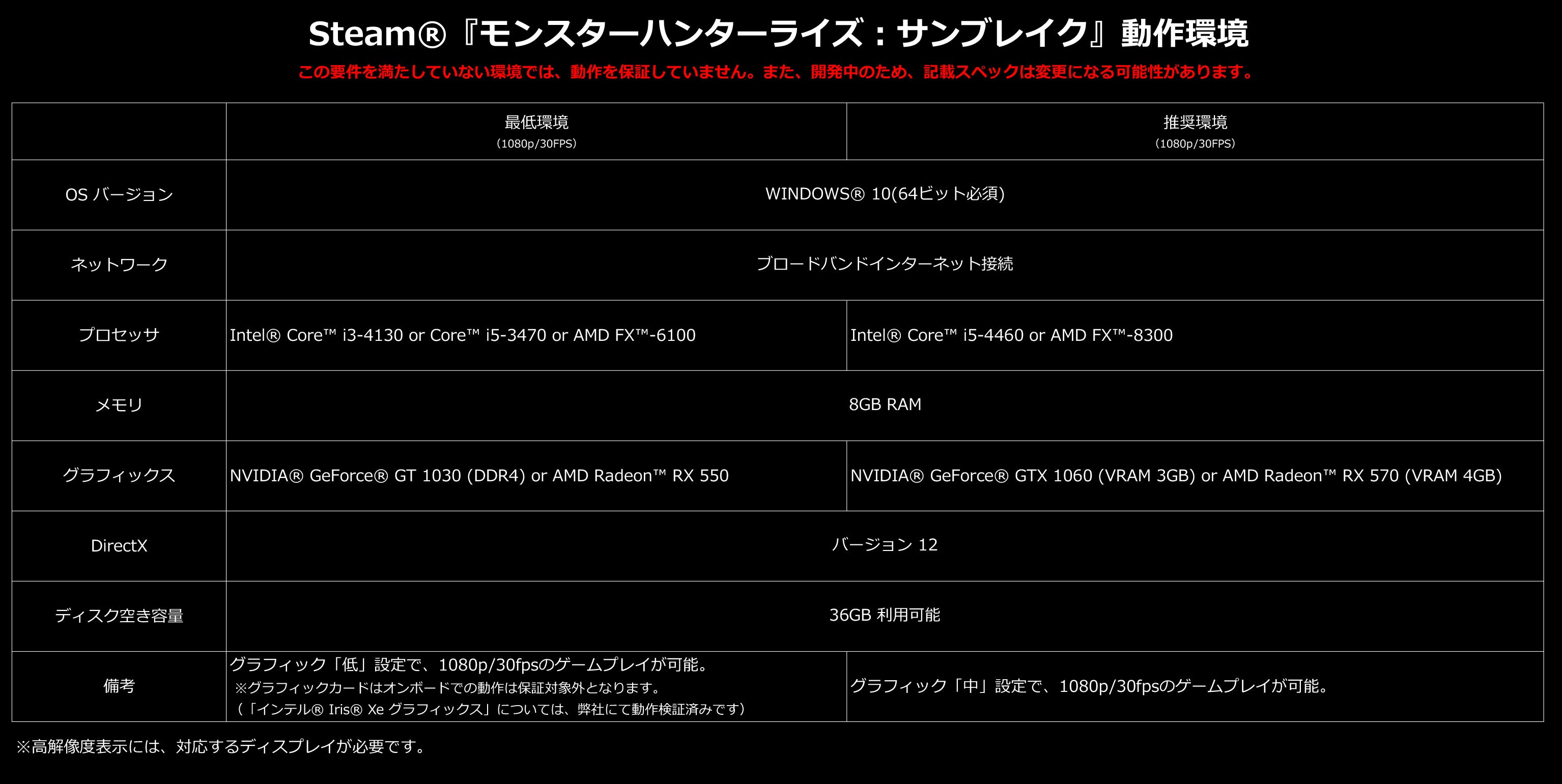 【Steam®『モンスターハンターライズ:サンブレイク』動作環境】