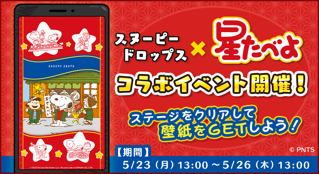 450万人以上がプレイした爽快パズルゲーム『スヌーピードロップス』にて、星の形をしたサラダせんべい「星たべよ」との、スペシャルコラボを開催します!