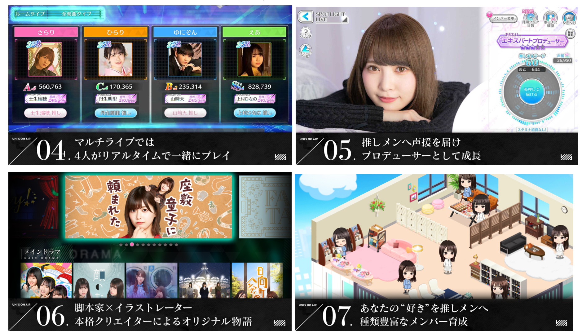 オリジナルの短編物語「ドラマ」や ちっちゃいメンバーと触れ合う「事務所」など、 グループの世界観に触れられる機能を多数実装!