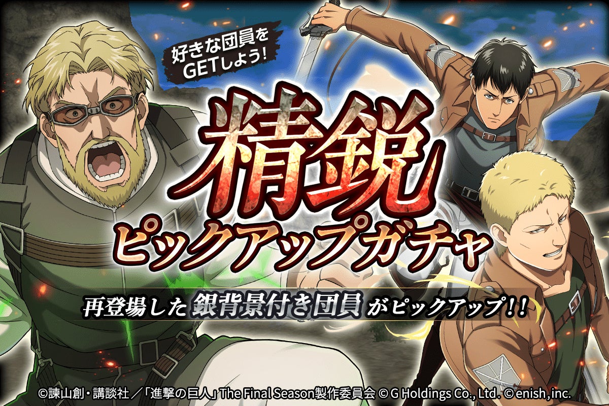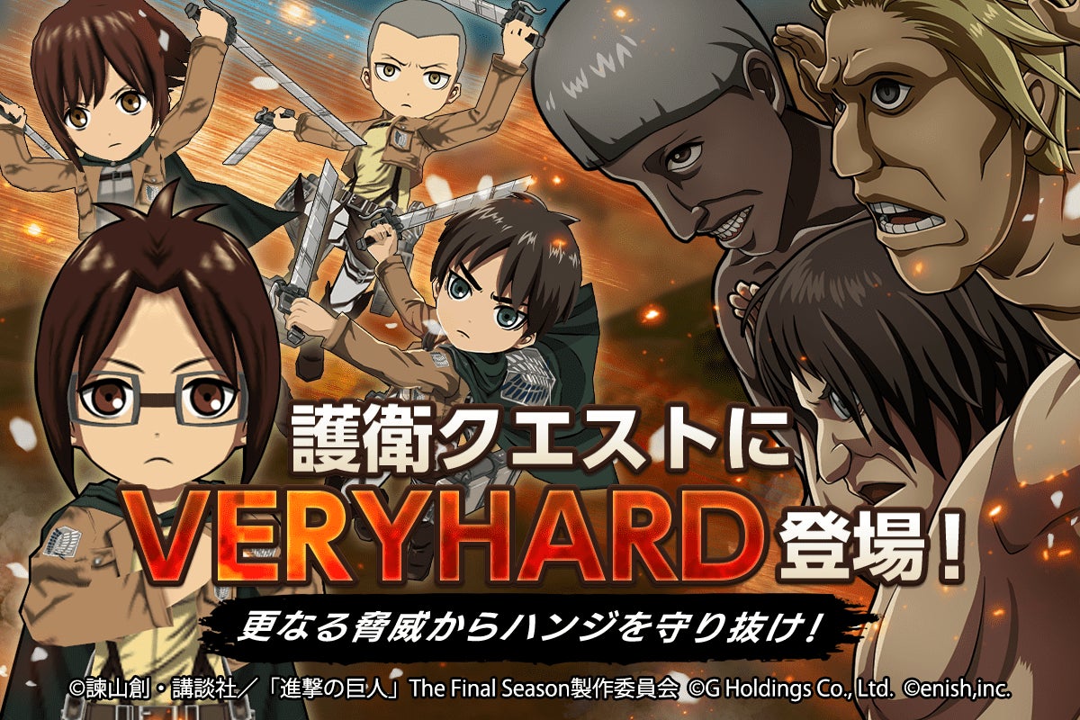 株式会社enish(本社:東京都港区、代表取締役社長:安徳 孝平、以下enish)は、アニメ『進撃の巨人』のスマートフォンゲーム最新作「進撃の巨人Brave Order」にて、壁外調査100Kmまで、護衛クエストにVERYHARD、団員からの依頼書にサシャ/エルヴィンからの依頼のコンテンツを追加いたしました。新たな高難易度クエストであなたは人類に成果をもたらすことができるのか!?また、本日より【訓練兵団】ライナー・ブラウンなどの銀背景団員がピックアップされた「精鋭ピックアップガチャ」も同時開催!更に、5月29日(日)19:30からゲストにミカサ役の石川由依さんが出演する、公式生放送「ブレオダ通信」第二回を配信!その他、最新情報はゲーム公式サイト・ゲーム公式Twitterアカウントにて随時公開して行きますので、ぜひご覧ください。
