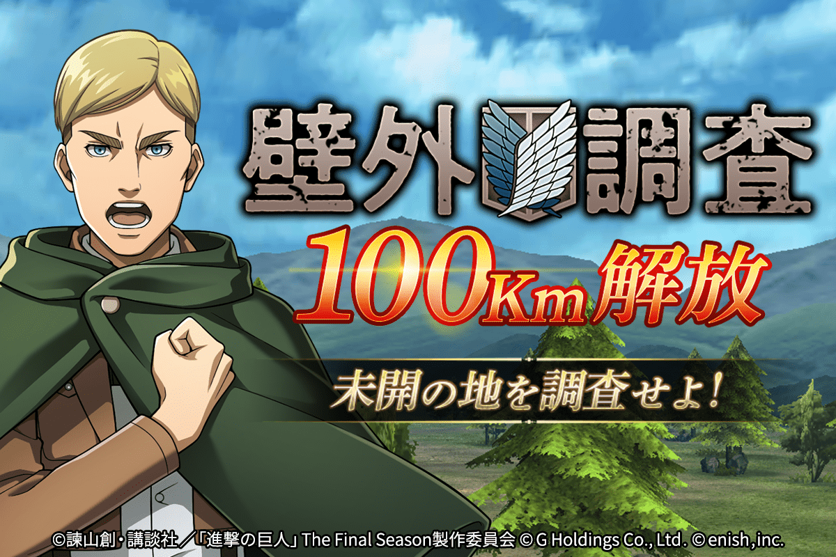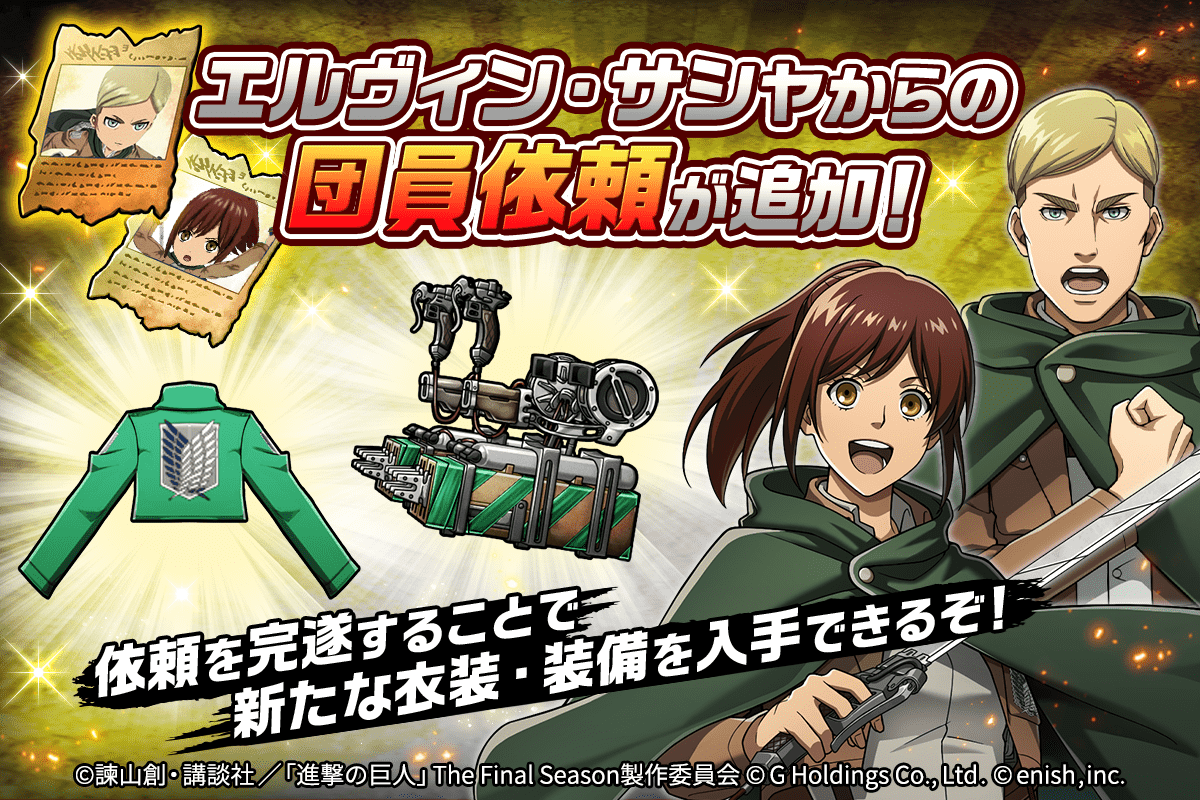 株式会社enish(本社:東京都港区、代表取締役社長:安徳 孝平、以下enish)は、アニメ『進撃の巨人』のスマートフォンゲーム最新作「進撃の巨人Brave Order」にて、壁外調査100Kmまで、護衛クエストにVERYHARD、団員からの依頼書にサシャ/エルヴィンからの依頼のコンテンツを追加いたしました。新たな高難易度クエストであなたは人類に成果をもたらすことができるのか!?また、本日より【訓練兵団】ライナー・ブラウンなどの銀背景団員がピックアップされた「精鋭ピックアップガチャ」も同時開催!更に、5月29日(日)19:30からゲストにミカサ役の石川由依さんが出演する、公式生放送「ブレオダ通信」第二回を配信!その他、最新情報はゲーム公式サイト・ゲーム公式Twitterアカウントにて随時公開して行きますので、ぜひご覧ください。