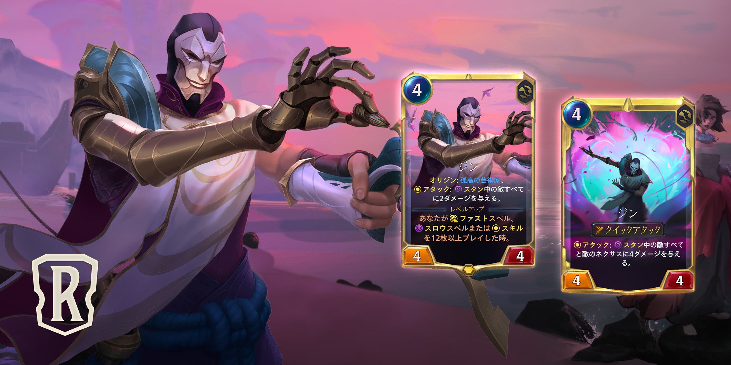 ジンはLoR史上初のルーンテラ チャンピオンです。オリジンは「孤高の芸術家」で、これによりプレイヤーはスキルありのカードであればデッキに加えることができます。
