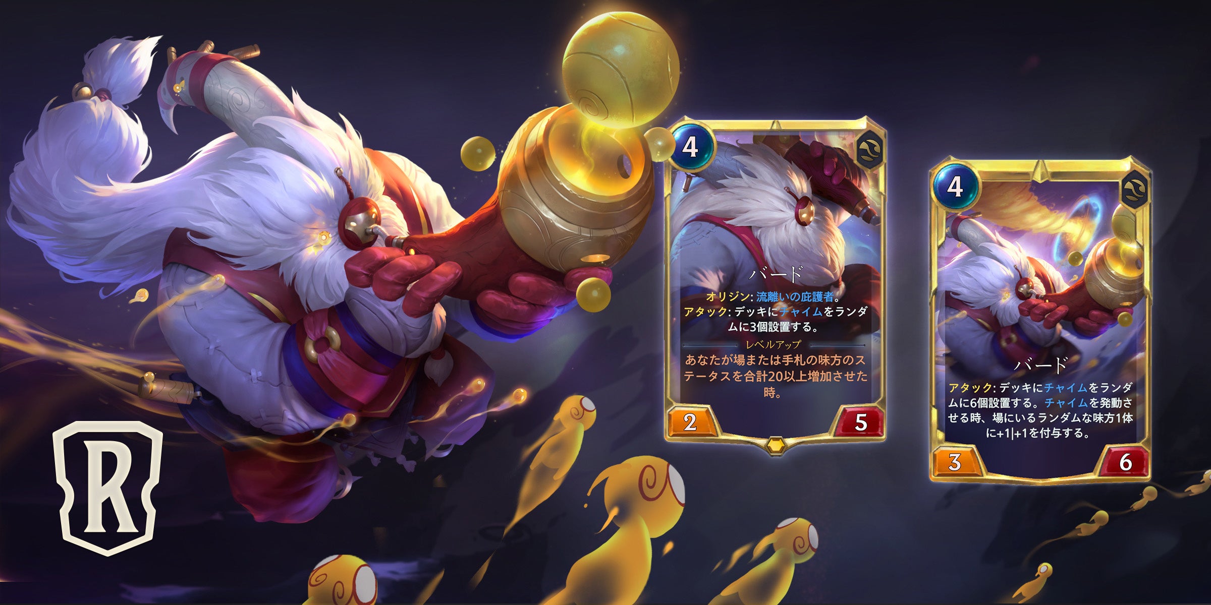 バードは今セットで登場する二体目のルーンテラ チャンピオンであり、仲間たちとともにたくさんのチャイムをデッキに設置します。これにより手札のカードはステータス面において多大なる恩恵を得ることができます。