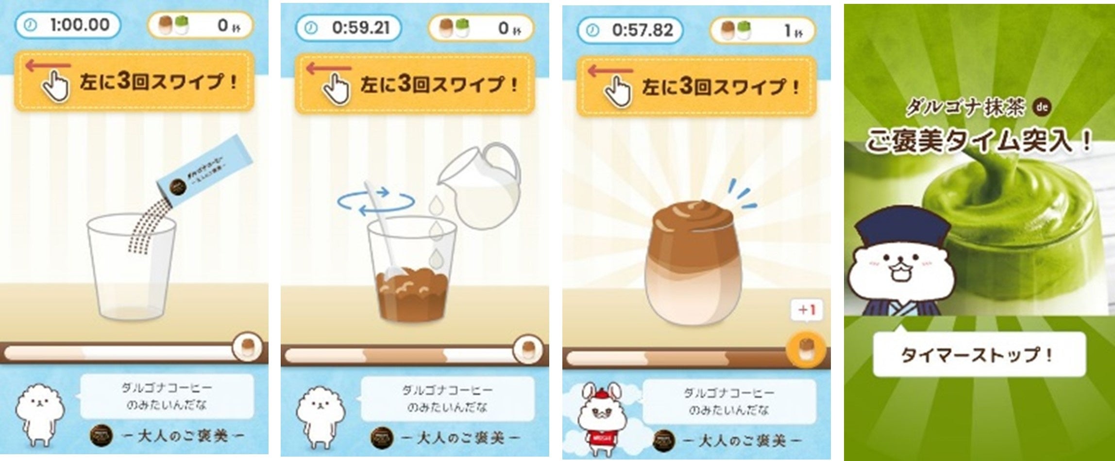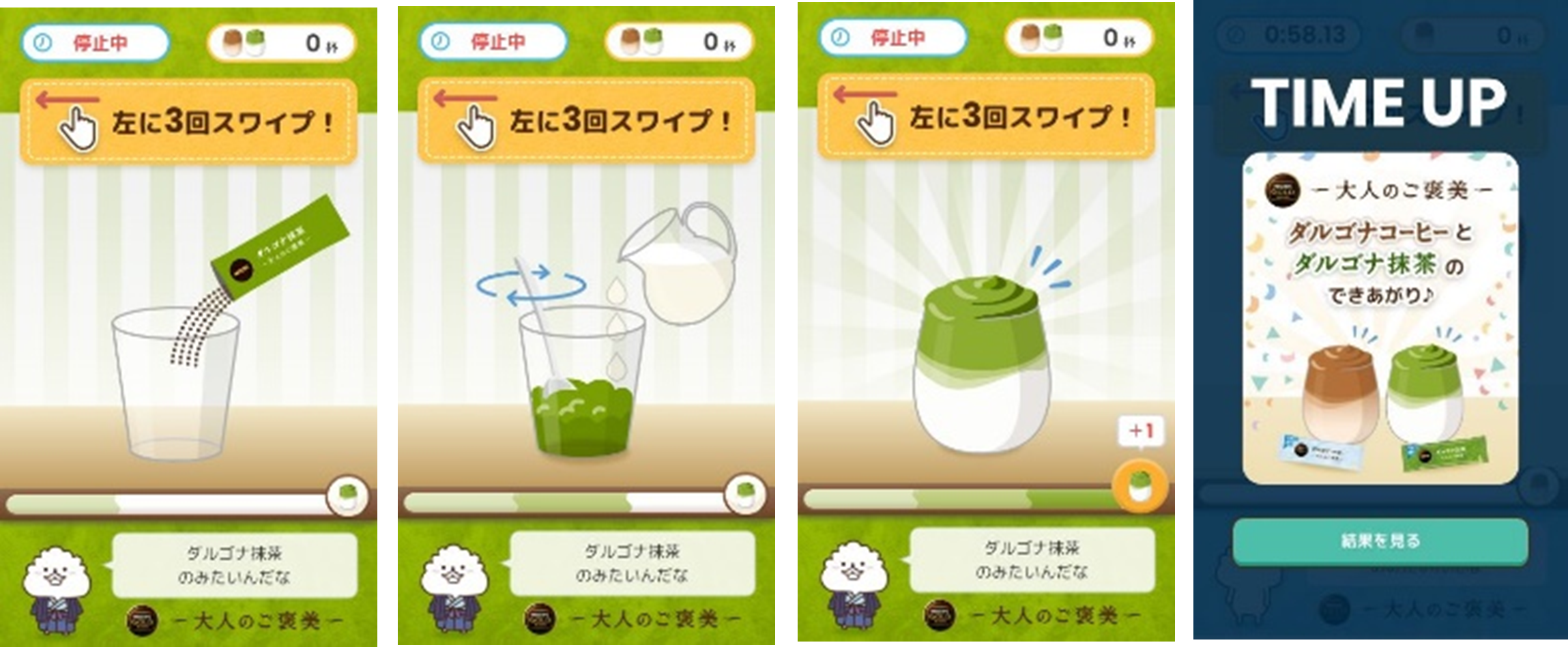 1分間にスマートフォンの画面をスワイプ(※)してダルゴナコーヒーを何杯つくれるかにチャレンジする「ダルゴナコーヒー まぜふわ1分チャレンジ」は、約1分で”ダルゴナコーヒー”を楽しめるという「ネスカフェ ゴールドブレンド 大人のご褒美 ダルゴナコーヒー」の特長を体感できるゲームコンテンツとして好評をいただき、昨年5月の公開から延べ3万人以上の方にお楽しみいただいております。