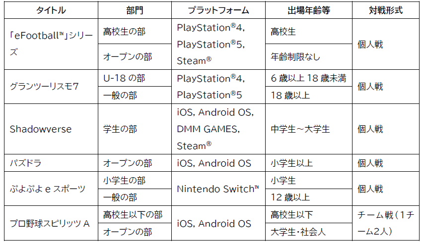 ※「eFootball™」については、大会予選~本戦期間中にソフト更新の可能性があるため「シリーズ」表記としています。 「PlayStation」および「グランツーリスモ」は、株式会社ソニー・インタラクティブエンタテインメントの商標または登録商標です。 DMMは、合同会社DMM.comの登録商標です。 Steamは、米国及びその他の国のValve Corporationの商標または登録商標です。 Nintendo Switchは任天堂の商標です。