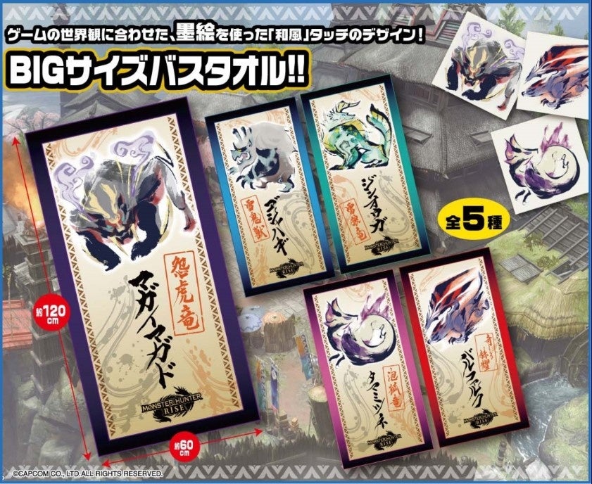 モンスターハンターライズに登場するモンスターの墨絵をあしらったバスタオルシリーズ。