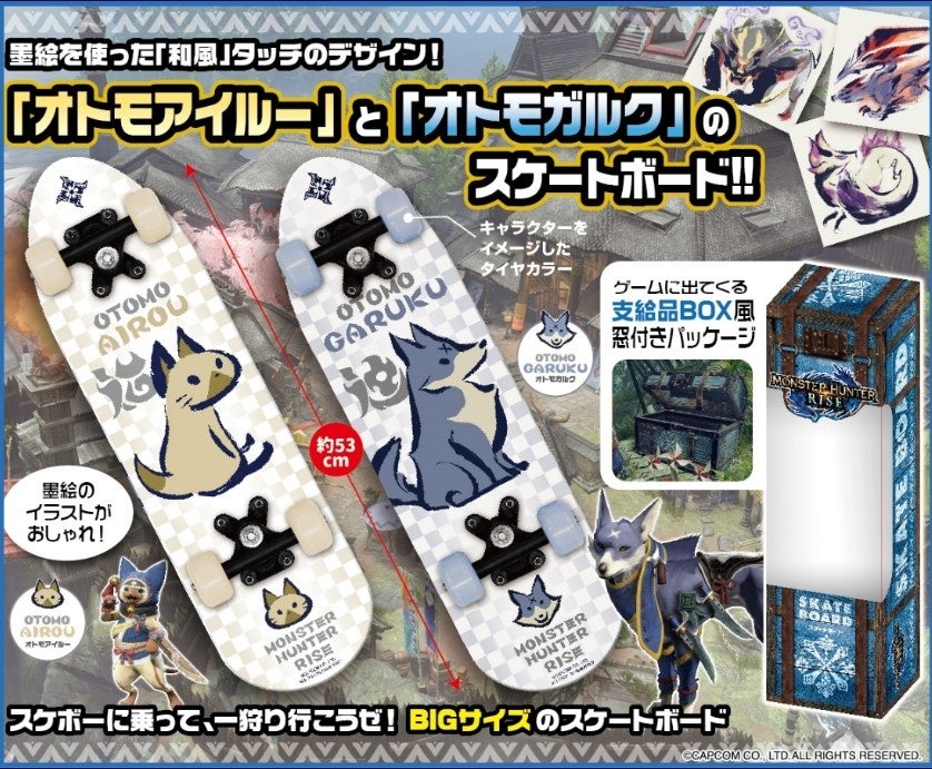 モンスターハンターライズの頼れるオトモ達「オトモガルク」と「オトモアイルー」がスケートボードに!各キャラクターをイメージしたカラーリングがポイントです。墨絵のイラストがクールな和風スケートボードで街中を冒険しよう!