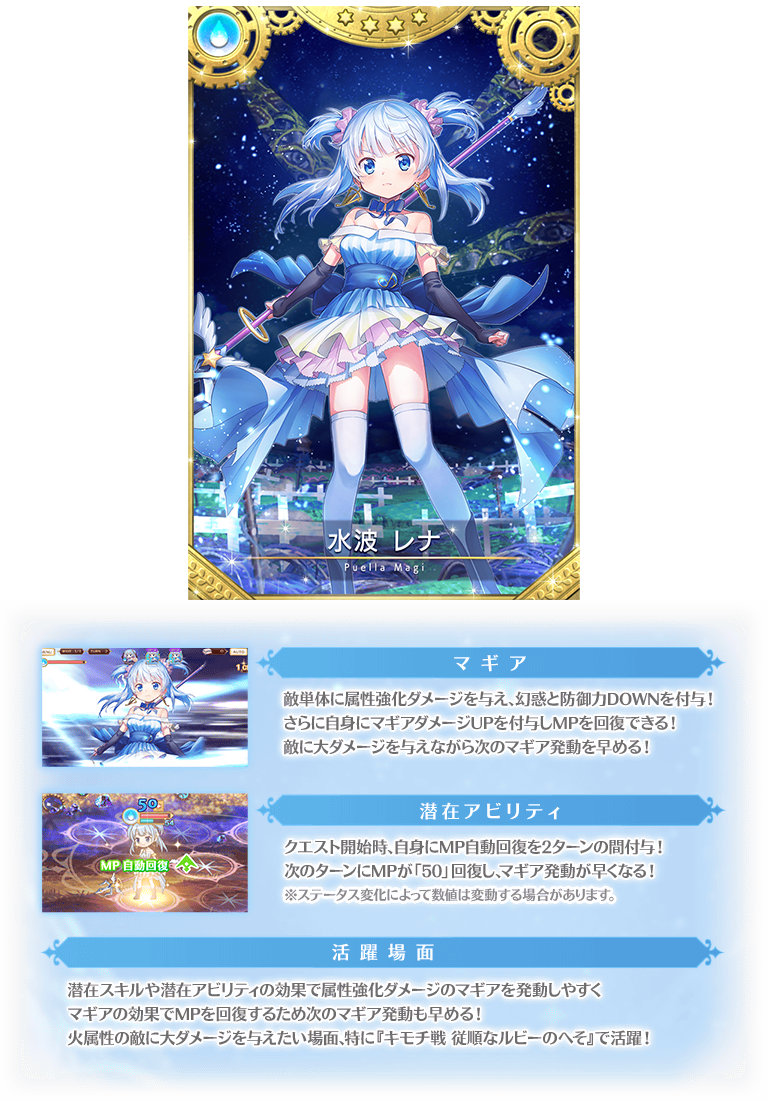 『期間限定 水波レナ アニメver. ピックアップガチャ』では、下記ピックアップ対象の魔法少女およびメモリアの提供割合がアップしております。