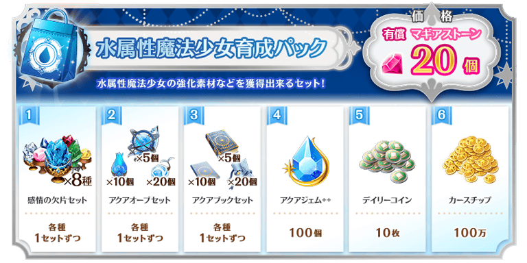 無償を含むマギアストーンで購入できる「水属性魔法少女育成パック(無償)」には以下のアイテムが封入されています。