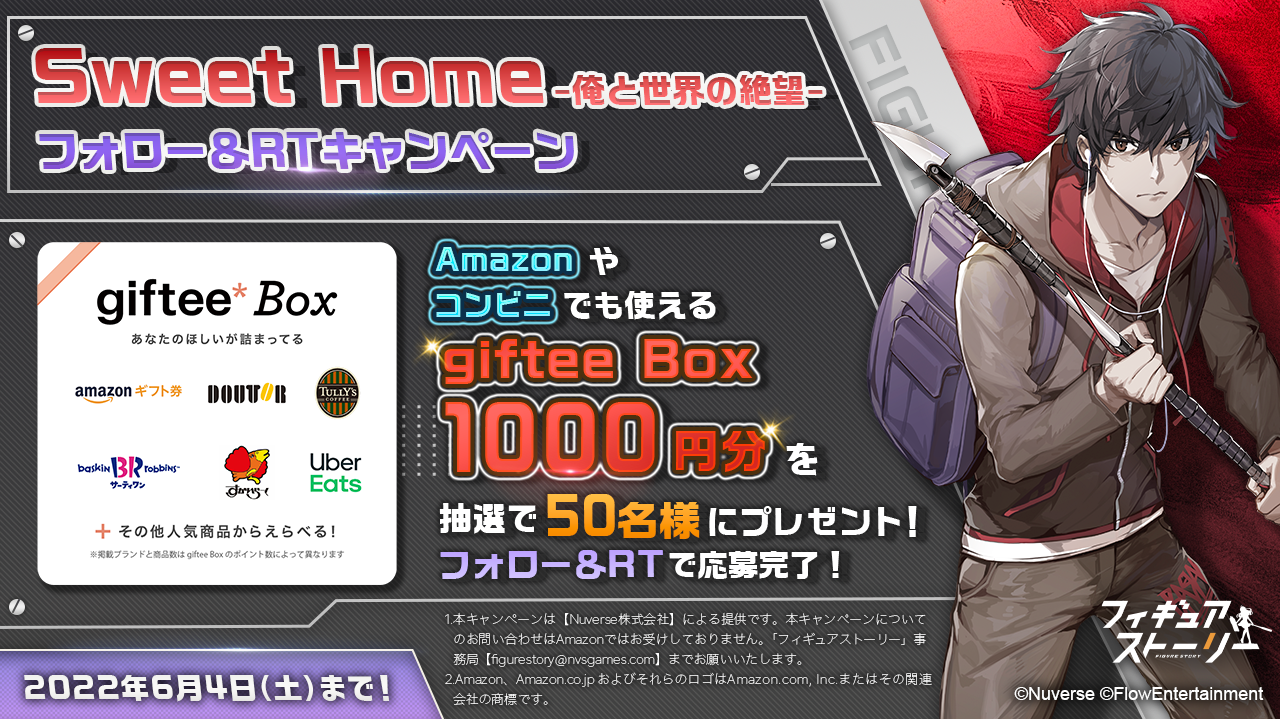 内容:「Sweet Home」コラボレーションを記念したフォロー&RTキャンペーンを実施。ギアスト公式Twitterアカウントをフォローし、キャンペーンツイートをRTして応募すると、抽選で50名にAmazonやコンビニエンスストア、その他人気のお店で使えるgiftee Box1,000円分をプレゼント!