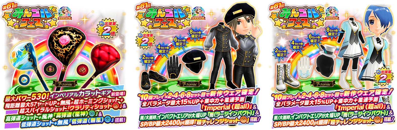 今回の「みんゴルフェス」には、「Imperial」シリーズから、ギアガチャには最大パワーが530かつ、新アクティブスキル「クラリティショット」に加え、アクティブスキル「高弾道(風神)」、「低弾道(無風)」を搭載した新ギア「インペリアルカラット」が登場いたします。ウェアガチャにもパッシブスキル「Imperial(超all)」「雨(ラージインパクト)」に加え、アクティブスキル「超チャレンジショット」など、複数スキルを搭載した新作ウェアが登場。この新作ウェアは「10回プレイ」2・4・6・8セット目で確定となります。ぜひ、ご参加ください!