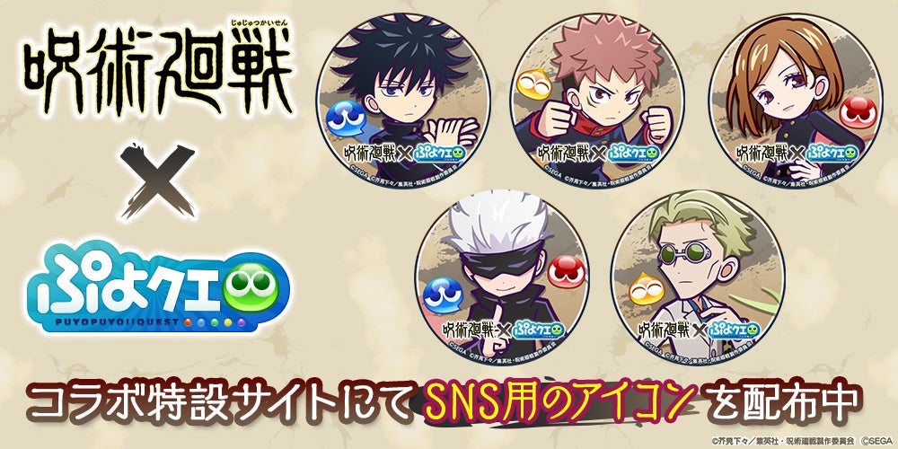 内容:『呪術廻戦』とのコラボを記念して、『ぷよクエ』オリジナルデザインのキャラクターのSNS用アイコンをコラボ特設サイトにて配布中です。お好きなキャラクターのアイコンをダウンロードしてご使用ください。