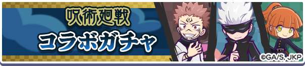 内容:「呪術廻戦シリーズ」「呪術廻戦コラボシリーズ」のキャラクターが登場する「呪術廻戦コラボガチャ」を開催。「呪術廻戦シリーズ」「呪術廻戦コラボシリーズ」のキャラクターは、★7へんしんが可能なキャラクターです。また、ガチャを引くごとに貯まる「ガチャパワー」を貯めると、貯めた「ガチャパワー」に応じて対象の★6キャラクターを追加で獲得できる、「ガチャパワー」機能対応のガチャです。