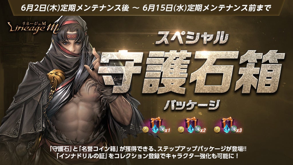 本パッケージでは、守護星の開放に必要な「守護石」、現在開催中の「アップデート記念イベント」にて期間限定で獲得可能な「英雄級/伝説級スキルブック」の購入のほか血盟商人を通じて様々なアイテムと交換可能な「名誉コイン」が大量に獲得できる「名誉コイン箱」が獲得できます。