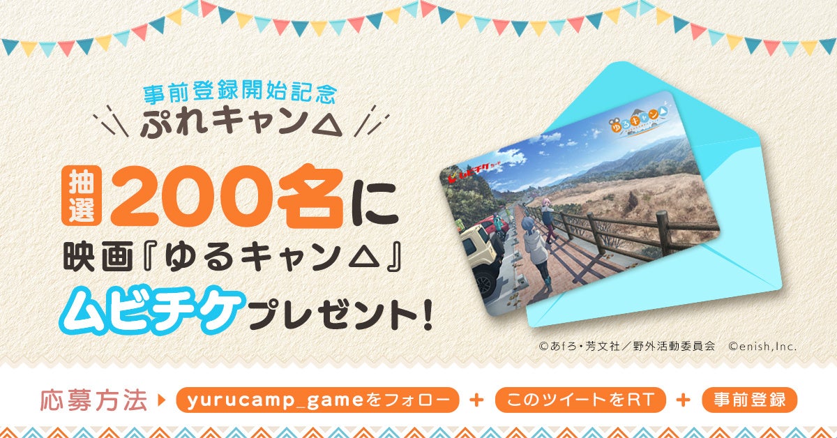 『ゆるキャン△』スマホゲームプロジェクト公式Twitterアカウントをフォローして、対象ツイートをRT、さらにゲーム公式ウェブサイトにてメールアドレスを登録いただいた方の中から、抽選で200名様に映画『ゆるキャン△』のムビチケをプレゼントいたします。