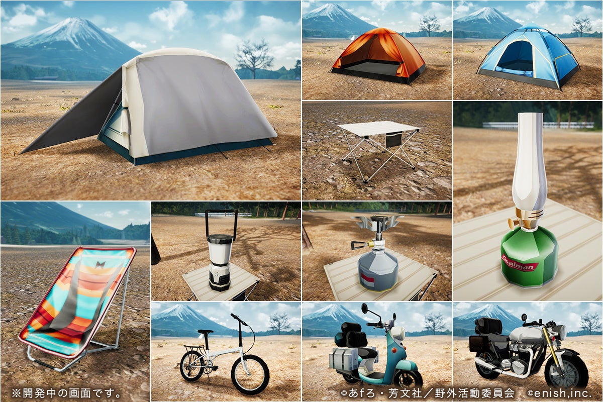 本タイトルに登場するギアは、TVアニメ『ゆるキャン△』に登場するものを基本に、1,000アイテム以上を予定しています。本プレスリリースでは、そのごく一部をご紹介。ゲーム公式ウェブサイトで、さらに多くのギアをご覧いただけます。ぜひアクセスしてご覧ください。