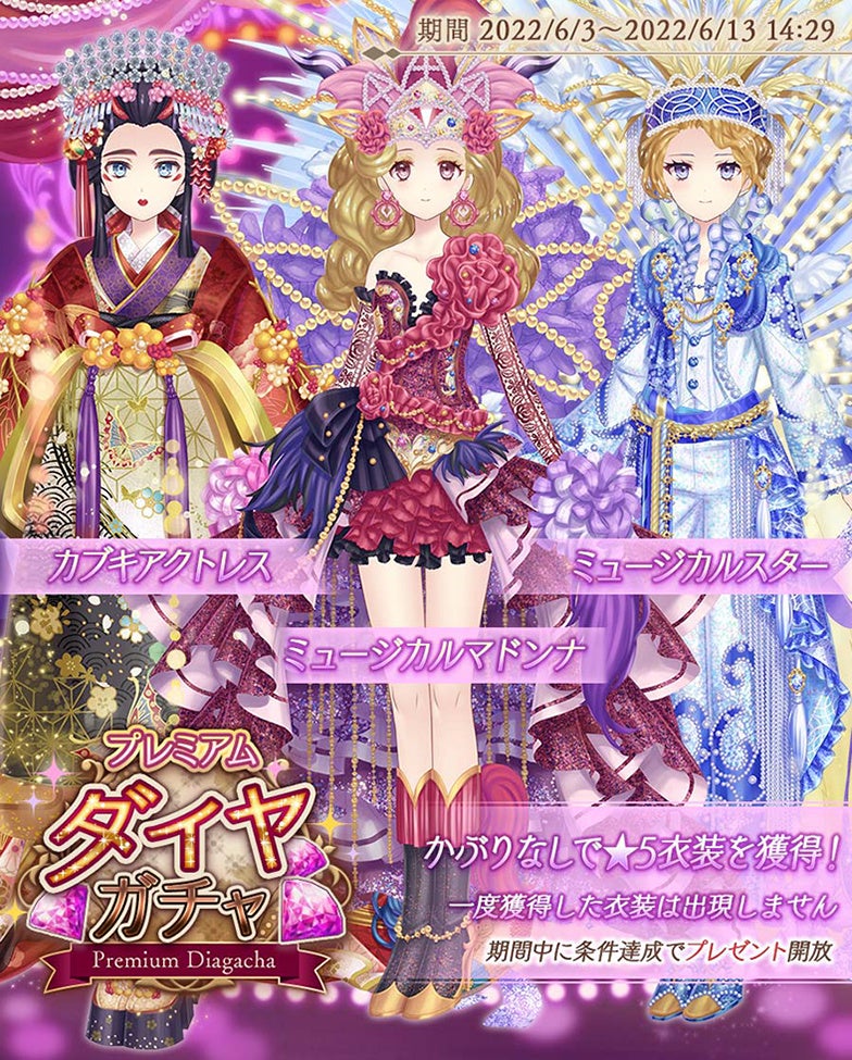 プレミアムダイヤガチャに「ミュージカルスター」「ミュージカルマドンナ」「カブキアクトレス」が登場♪重複なしで衣装を獲得できますので、この機会にぜひお試しください♪