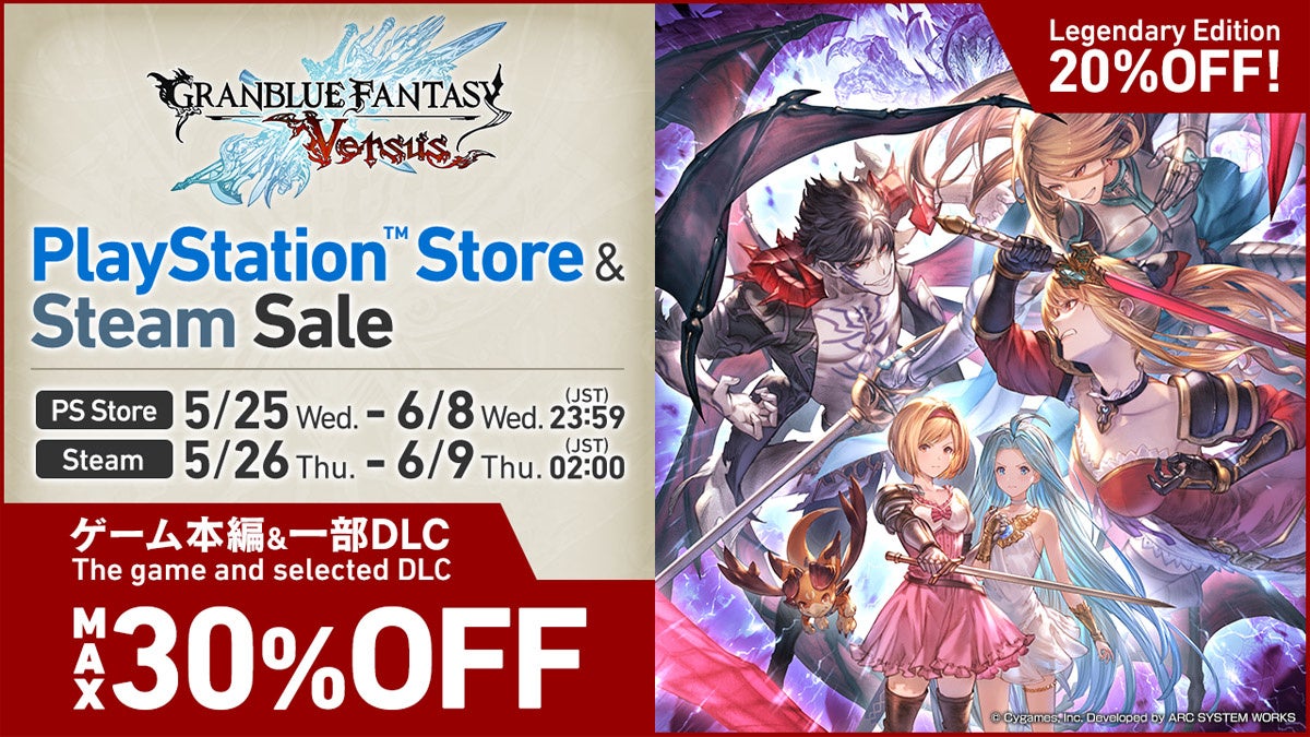 期間中、ゲーム本編に加え全DLCキャラクターが解放された『グランブルーファンタジー ヴァーサス レジェンダリーエディション』は20%OFF、ゲーム本編のみの『グランブルーファンタジー ヴァーサス Cygames Greatest Hits』は30%OFFと、お得な価格で購入することができます。