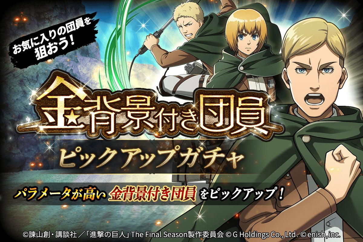 株式会社enish(本社:東京都港区、代表取締役社長:安徳 孝平、以下enish)は、アニメ『進撃の巨人』のスマートフォンゲーム最新作「進撃の巨人Brave Order」にて、巨人殲滅戦に新たな脅威となる「謎の巨人 女型」を追加いたしました。迫りくる新巨人を殲滅し豪華報酬を獲得せよ!また、連合の団員とともに協力して連合の総戦闘力で競い合うランキング&ミッションイベント「第2回連合対抗~女神の栄冠~」を開催!更に、本日より【調査兵団マント】エルヴィン・スミスなどの団員がピックアップされた「金背景付き団員ピックアップガチャ」も同時開催!その他、最新情報はゲーム公式サイト・ゲーム公式Twitterアカウントにて随時公開して行きますので、ぜひご覧ください。