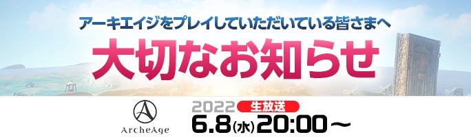 株式会社ゲームオン[本社:東京都渋谷区、代表取締役社長:文 智秀(ムン・ジス)] は、超大型MMORPG『ArcheAge(アーキエイジ)』において、本日6月8日(水)20時に「大切なお知らせ」と題した生放送を実施いたします。今後予定しております「サーバー統合」に関する情報をご案内させていただく予定となっておりますので、ぜひご視聴ください。
