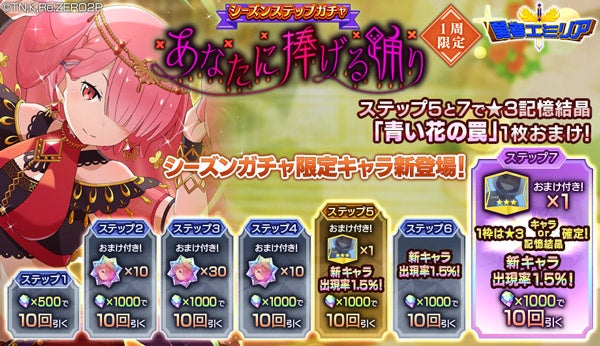 内容:ストーリーイベント「勇者エミリア」の特効を持ったキャラクター「【あなたに捧げる踊り】ラム★3」、記憶結晶「青い花の罠★3」の出現率がUPする「シーズンガチャ【あなたに捧げる踊り】」を開催します。